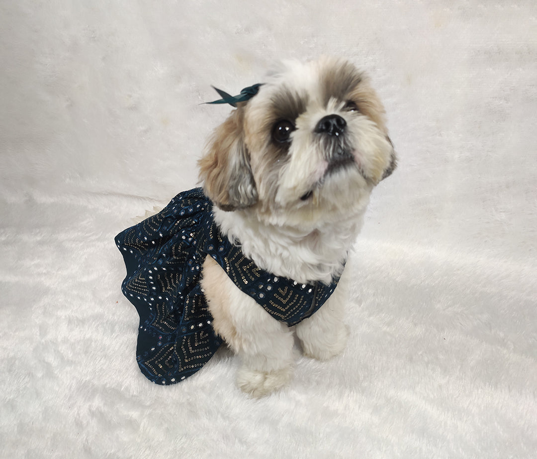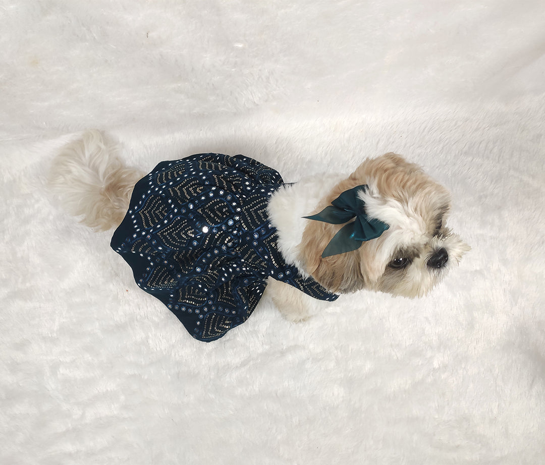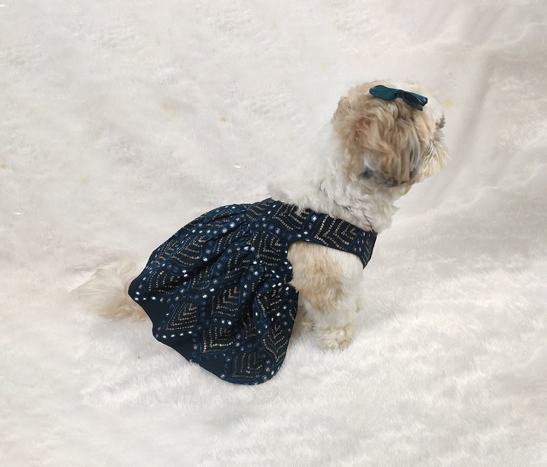Dress your furry princess in this stunning Georgette Embroidery Mirror Work Turquoise Frock, expertly crafted for comfort and style.